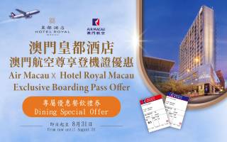 From now until August 31, 2026, simply present your valid Air Macau boarding pass (within 7 days of arrival) to enjoy exclusive privileges at Hotel Royal Macau! Don’t miss out! Redeem your certificate at the hotel lobby and indulge in an unforgettable culinary journey.
