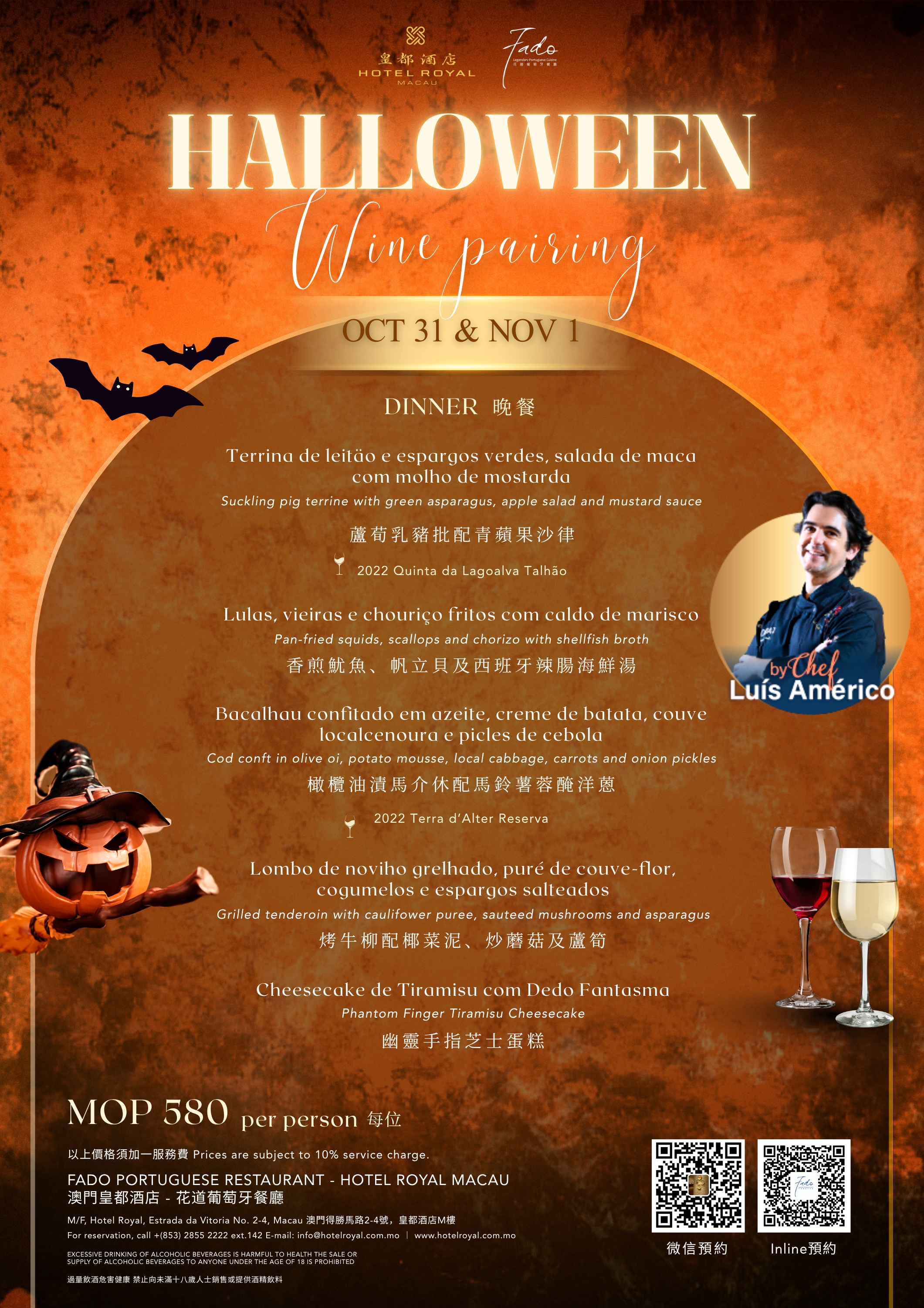 皇都酒店花道葡萄牙餐厅邀请您来FADO享受一场神秘的万圣节盛宴!迎合节日气氛,特别设计鬼怪菜肴,融合葡萄牙风味,搭配精选美酒,让您的万圣节夜晚充满神秘与美味!