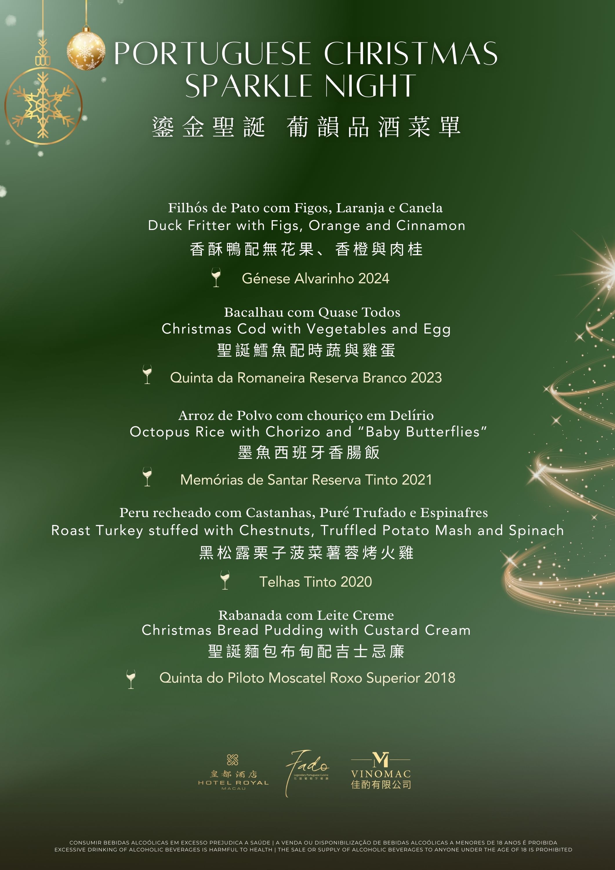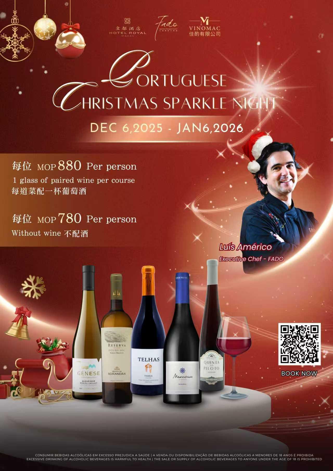 澳門皇都酒店旗下「花道葡萄牙餐廳」推出節慶限定「鎏金聖誕葡韻品酒盛宴」。由星級行政總廚Luís Américo攜手酒商Vinomac,以葡萄牙傳統聖誕美饌為靈感,設計專屬節慶菜單,搭配嚴選葡國佳釀,為您呈現一場充滿伊比利亞風情的聖誕盛宴。